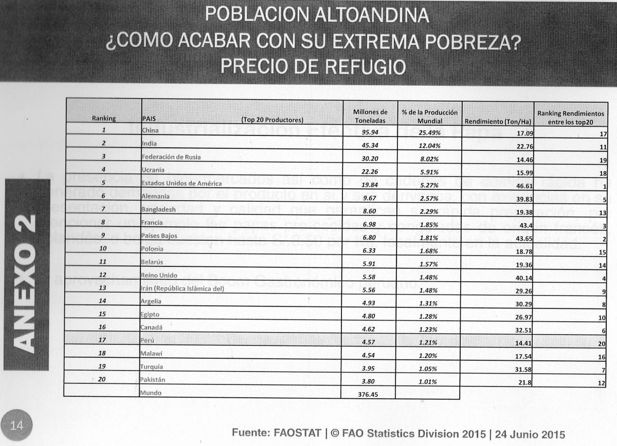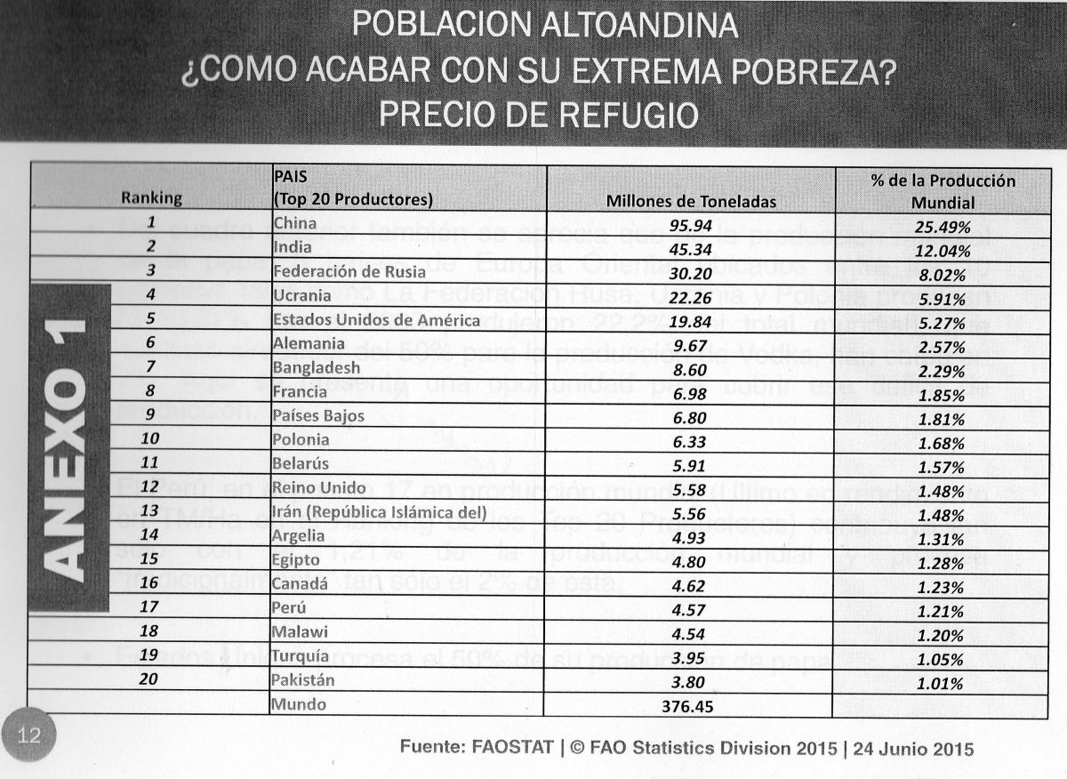 Perú, el país de la papa, produce solamente el 1.21% y es el último, repito, último en rendimiento entre los Top 20, produciendo 14.41TM/Ha. (Anexo N°2), Cabe notar que en la Costa la producción es de 35TM/Ha promedio y en la Sierra Altoandina es de 1TM/Ha. A ese agricultor que debería producir mínimo 10TM/Ha y si se le pagara el precio justo, sus ingresos mejorarían en 100 veces, 10 veces por su nueva producción y 10 veces por el precio justo, en otras palabras, si vendiendo su papa en todo el año saca 1000 soles es 83 soles mensuales, menos que los 100 soles del bono de ayuda del gobierno, con el precio de refugio sacaría 100,000 soles, por la razón antes expuesta.