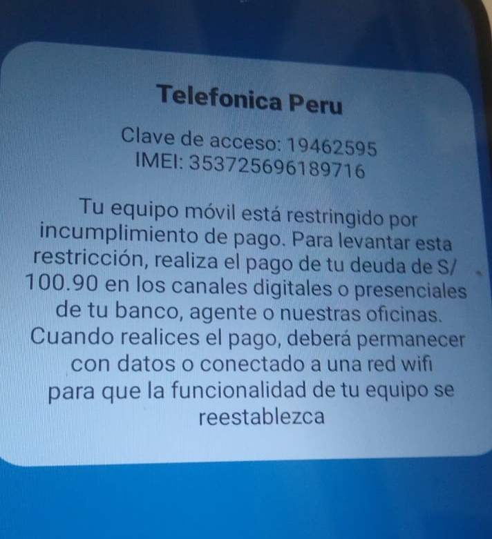 Tu equipo móvil está restringido por incumplimiento de pago. Para levantar esta restricción, realiza el pago de tu deuda de S/ xxx en los canales digitales o presenciales de tu banco, agente o nuestras oficinas.