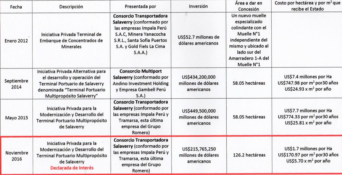 -Como se puede apreciar, en las Iniciativas Privadas propuestas por el Consorcio Transportadora Salaverry los montos de inversión y las hectáreas de terreno dadas en concesión han variado en desmedro de los intereses nacionales.