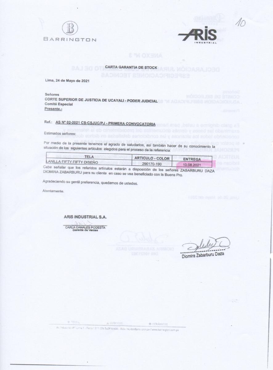 Doña Diomira, subrayó en otra carta que figura como Anexo 3 y como Declaración Jurada de Cumplimiento de las especificaciones técnicas:
