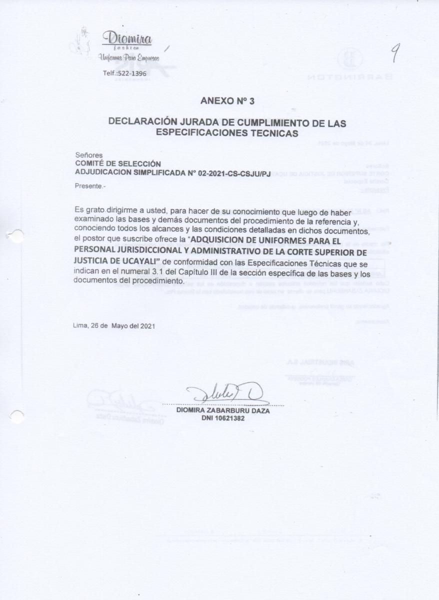 “Es grato dirigirme a usted, para hacer de su conocimiento que luego de haber examinado las bases y demás documentos del procedimiento de la referencia y conociendo todos los alcances y las condiciones detalladas en dichos documentos, el postor que suscribe ofrece la “ADQUISICIÓN DE UNIFORMES PARA EL PERSONAL JURISDICCIONAL Y ADMINISTRATIVO DE LA CORTE SUPERIOR DE JUSTICIA DE UCAYALI” de conformidad con las Especificaciones Técnicas que se indican en el numeral 3.1 del Capítulo III de la sección específica de las bases y los documentos del procedimiento”.