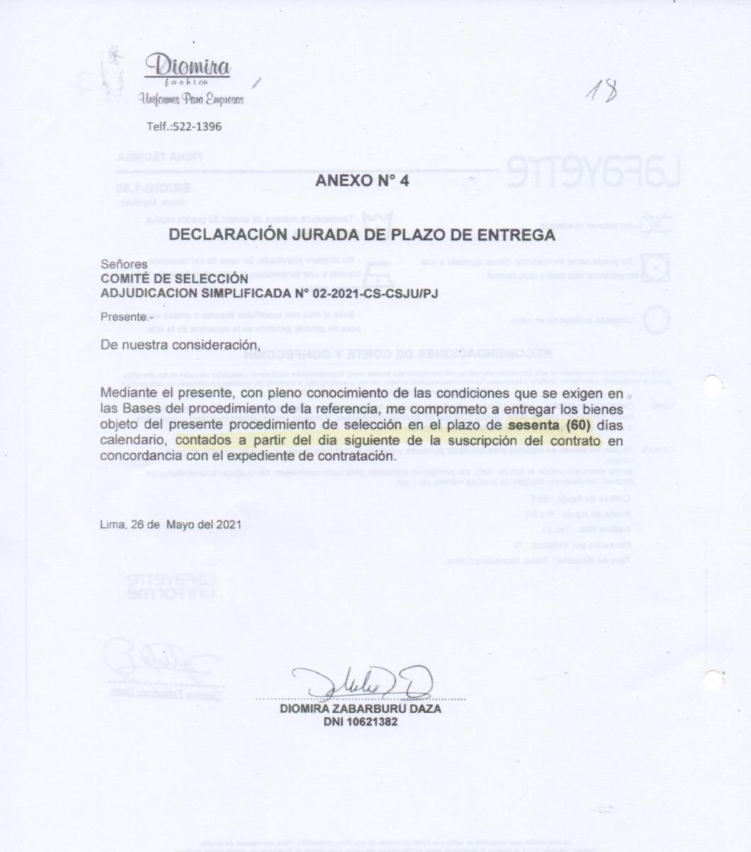 En el Anexo No. 4, Declaración Jurada del Plazo de Entrega, doña Diomira Zabarburu Daza, afirma lo siguiente, en carta dirigida al Comité de Selección: