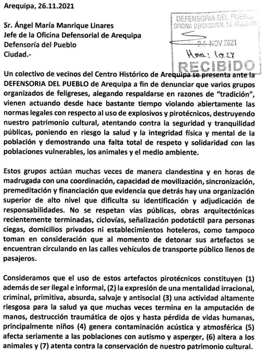 Un colectivo de vecinos del Centro Histórico de Arequipa se presenta ante la DEFENSORIA DEL PUEBLO de Arequipa a fin de denunciar que varios grupos organizados de feligreses, alegando respaldarse en razones de “tradición”, vienen actuando desde hace bastante tiempo violando abiertamente las normas legales con respecto al uso de explosivos y pirotécnicos, destruyendo nuestro patrimonio cultural, atentando contra la seguridad y tranquilidad públicas, poniendo en riesgo la salud y la integridad física y mental de la población y demostrando una falta total de respeto y solidaridad con las poblaciones vulnerables, los animales y el medio ambiente.