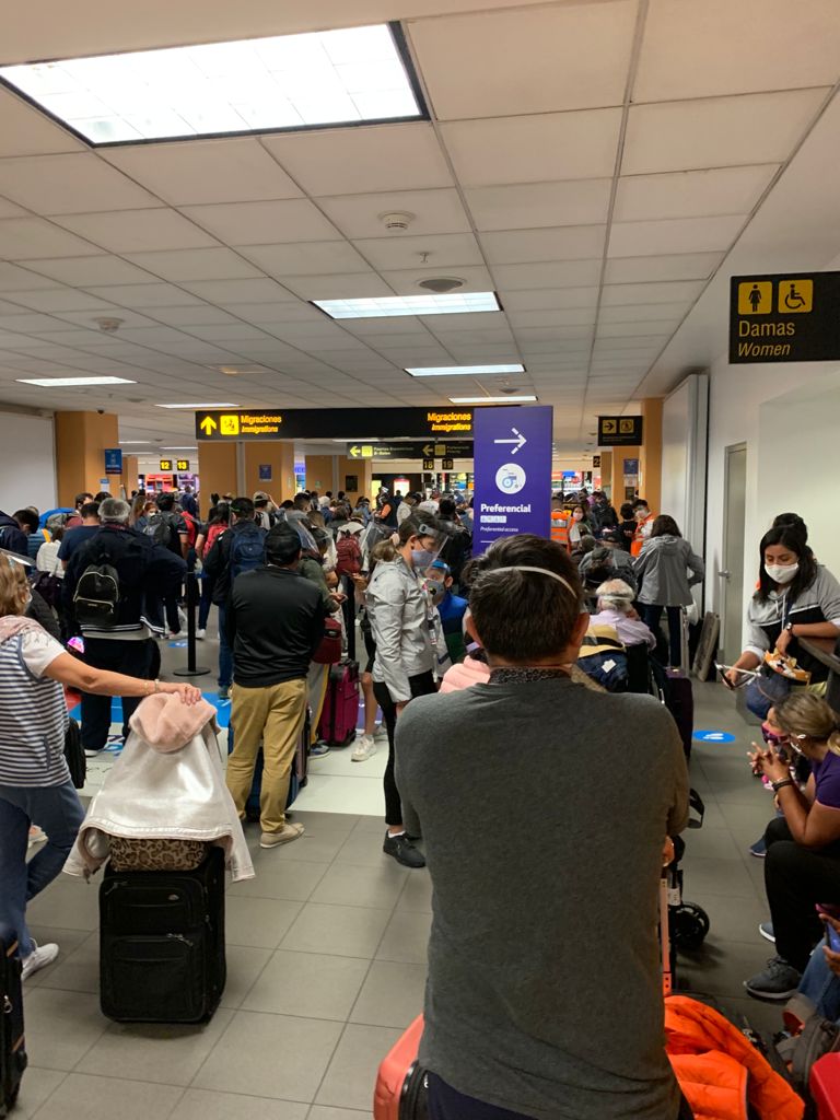 El viernes 28 de mayo a las 11.30 pm., ¡todos los pasajeros estaban aglomerados en el salón de ingreso al país! ¡Ninguna medida de bioseguridad y tampoco distanciamiento!