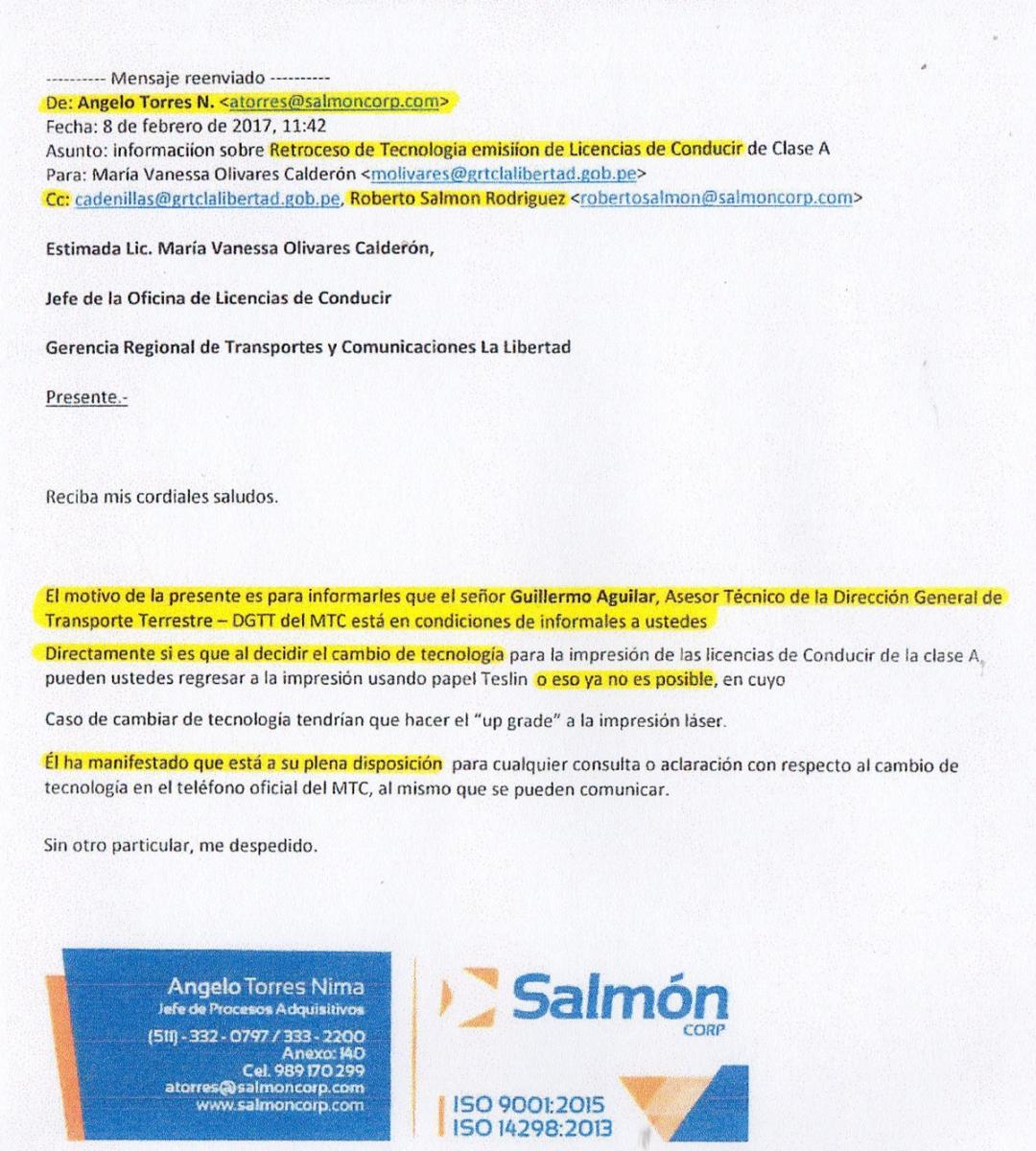 El señor Angelo Torres Nima, funcionario de Salmón Corp., piloteó al equipo de su empresa el pasado viernes. Dicha persona es quien “presenta” al funcionario asesor de la Dirección General de Transporte Terrestre, Guillermo Aguilar, ante la Región La Libertad el 8 de febrero del 2017, tal como puede apreciarse en el gráfico. Nunca ha respondido ni aclarado cómo es que alguien de la empresa privada “presentaba” a dependientes del Estado a otro colega de ellos.