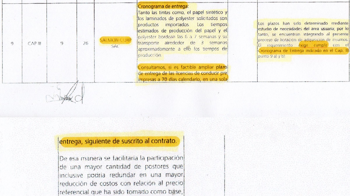 Tal como puede apreciarse en el gráfico, fiel reproducción de las consultas que hicieron las empresas, la firma Salmón Corp., indaga por el plazo y se le contesta que las entregas tendrán que hacerse a los 60 días. Es decir, Salmón Corp. conocía con muchísima anticipación que no iba a variarse esa condición. Fluye la pregunta de inmediato: ¿si sabía aquello, por qué “metió la pata?