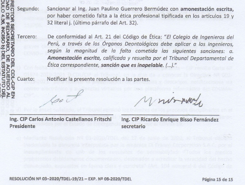 Más aún, en su Resolución No. 03-2020/TDEL-19-21, 13-8-2020, el Tribunal Departamental de Etica de Lima, del Colegio de Ingenieros del Perú, sostiene en su acápite Segundo: