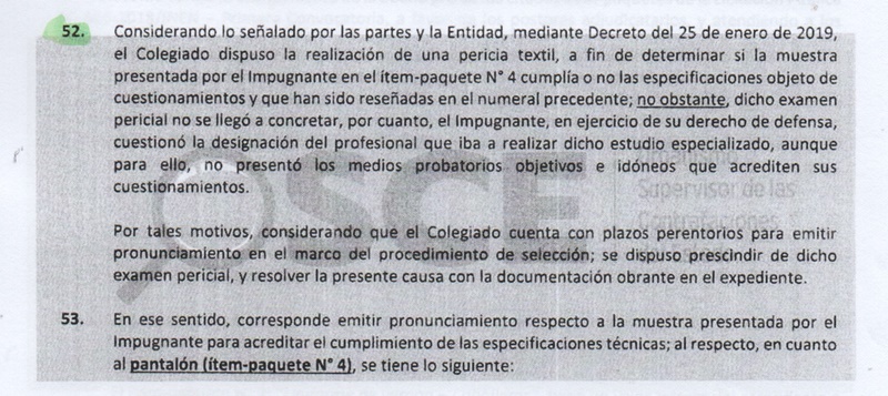 52. Considerando lo señalado por las partes y la Entidad, mediante Decreto del 25 de enero del 2019, el colegiado dispuso la realización de una pericia textil, a fin de determinar si la muestra presentada por el impugnante en los ítems-paquete cumplía o no las especificaciones objeto de cuestionamientos….; no obstante, dicho examen pericial no se llegó a concretar, por cuanto, el impugnante, en ejercicio de su derecho de defensa, cuestionó la designación del profesional que iba a realizar dicho estudio especializado, aunque para ello, no presentó medios probatorios objetivos e idóneos que acrediten sus cuestionamientos.