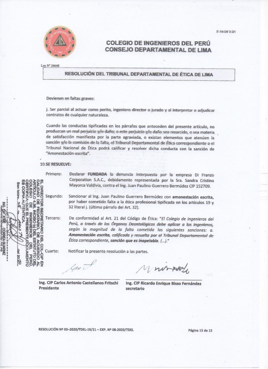 Lo singular de este caso es que el ingeniero no era perito y se hizo pasar por tal y la expresión institucional del Colegio de Ingenieros del Perú, es categórica determinando que en efecto, dicha persona NO está en la relación de peritos.