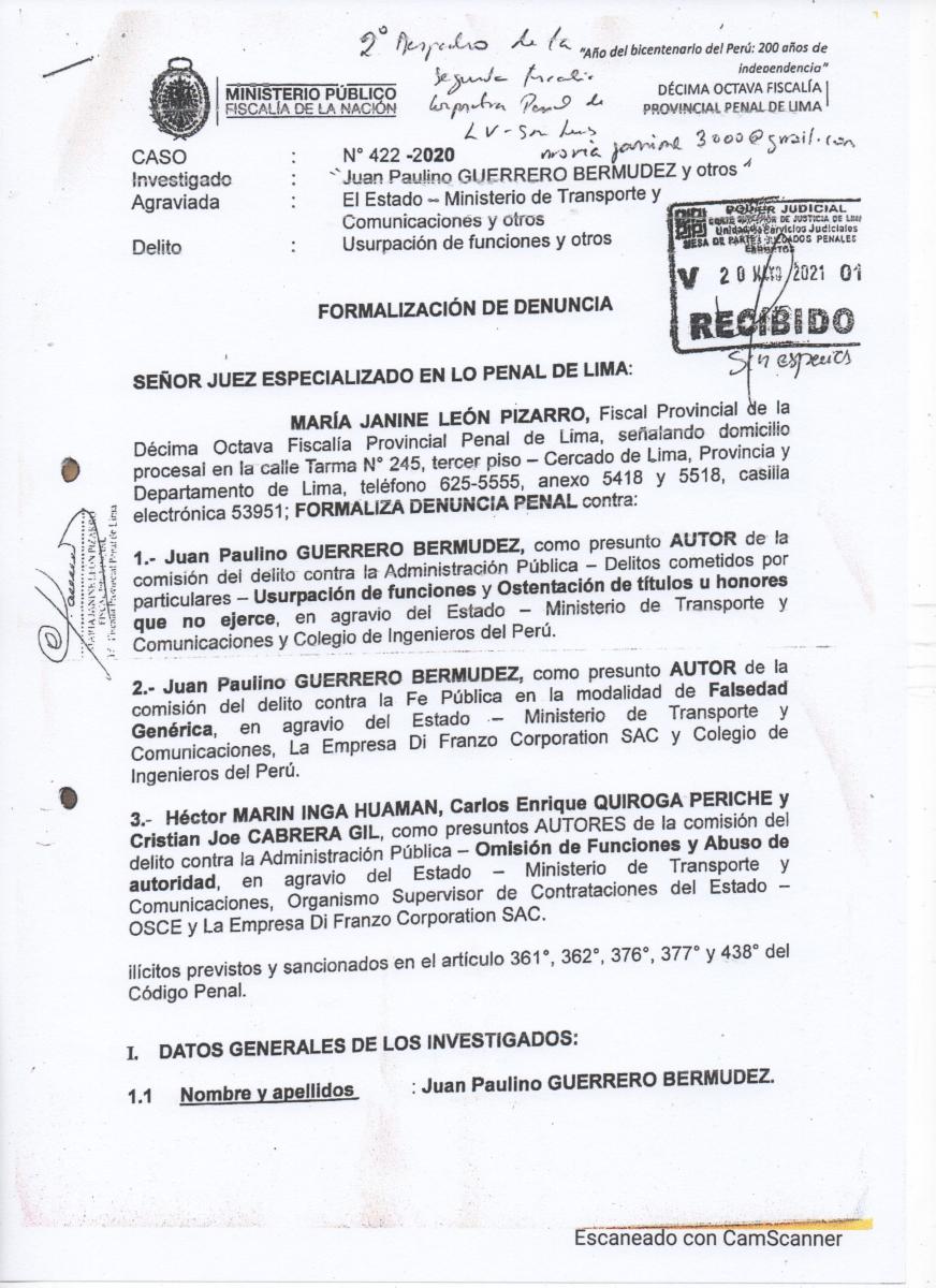 En efecto, el ingeniero Juan Paulino Guerrero Bermúdez ha sido denunciado penalmente por: